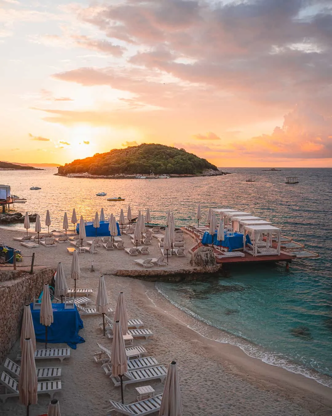 Imagine stepping onto powdery white sands where turquoise waters lap gently at your feet, so clear you can see schools of fish darting below. Ksamil, often hailed as the "Maldives of Europe," delivers this tropical paradise right in Albania's southern Riviera, drawing travelers who crave pristine beaches without crossing oceans. Here, the Ionian Sea gifts you four stunning beach strips—Ksamil Beach, Paradise Beach, Bora Bora Beach, and the iconic Ksamil Islands—each offering soft sands, shallow swimming zones perfect for families, and dramatic rocky backdrops dotted with olive groves. Sun loungers and umbrellas rent affordably, while beach bars serve fresh juices and grilled octopus, letting you soak up golden hours in pure relaxation.
